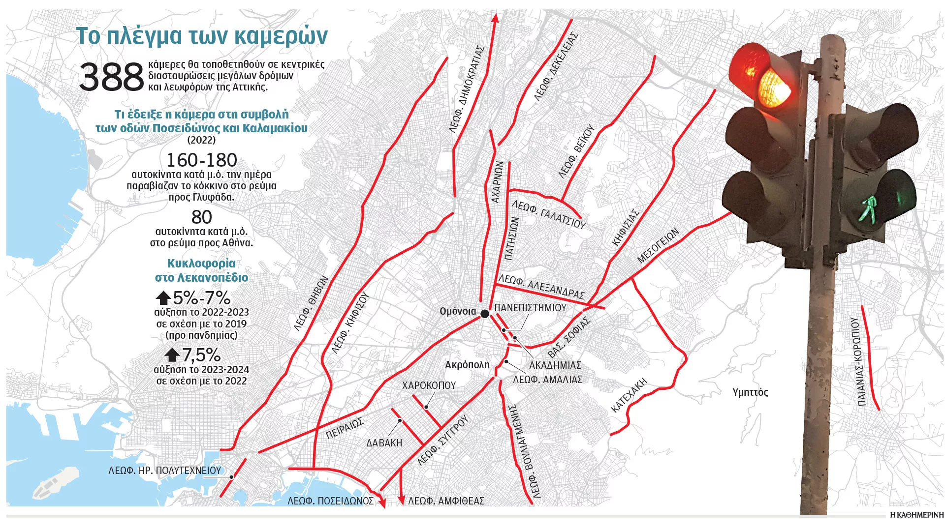 Σε 100 κομβικά σημεία του λεκανοπεδίου όπου σύμφωνα με τα στοιχεία της Τροχαίας συμβαίνουν τα περισσότερα ατυχήματα θα τοποθετήσει η Περιφέρεια Αττικής 388 «έξυπνες» κάμερες, με στόχο την 24ωρη καταγραφή των παραβιάσεων του ερυθρού σηματοδότη.