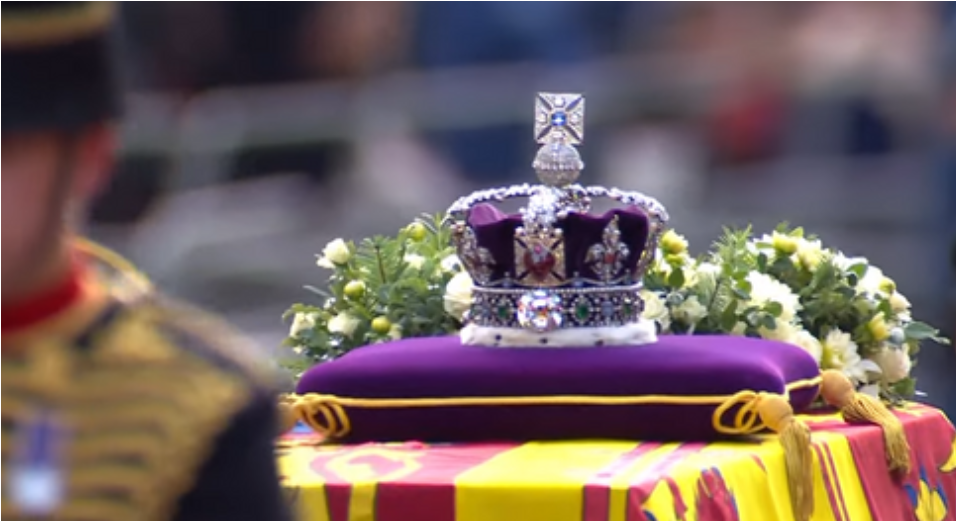 Το φέρετρο θα είναι σκεπασμένο με το βασιλικό λάβαρο και πάνω του θα είναι τοποθετημένο το Αυτοκρατορικό Στέμμα, το οποίο μεταξύ άλλων κοσμείται από πετράδι κομμένο από το μεγαλύτερο διαμάντι του κόσμου, γνωστό ως Cullinan. Η πομπή θα διανύσει μια απόσταση 1.800 μέτρων και εκτιμάται πως θα διαρκέσει περίπου 38 λεπτά, κατά τα οποία θα ακούγονται πένθιμοι κανονιοβολισμοί και η καμπάνα του – προσφάτως ανακαινισμένου – Μπιγκ Μπεν.